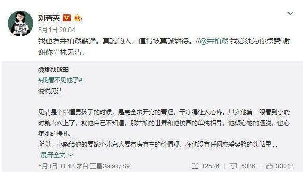 2018年5月初,井柏然终于回归微博了,虽然没有发布新微博,只是点了个赞,但也可以看出他终于从乔任梁去世的阴影中走了出来。井柏然点赞的这条微博,是一位网友写的影评,他详细、深刻的阐述了他对井柏然饰演的“林见清”角色的理解,得到井柏然的认同。被井柏然点赞评论了,井柏然留言说:“我必须为你点赞,谢谢你懂林见清。”