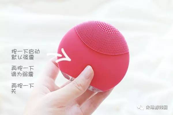 洁面仪正面的正中下方有个按钮,按一下是开,默认开启的档是强震,用于洁面