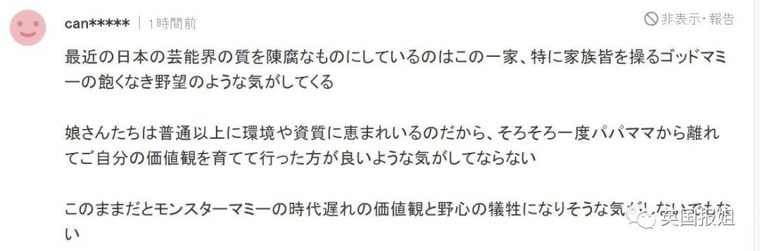 “我觉得正是因为这个家庭贪得无厌的成名野心,操纵着家里的每个人,才使得现在的日本娱乐业的氛围如此陈腐。