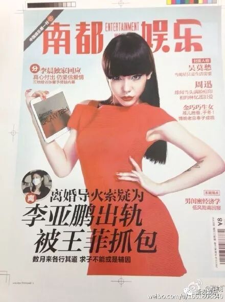 当时南都的主编在微博晒了下一期杂志的封面,上面直接写着李亚鹏疑似出轨被抓包....