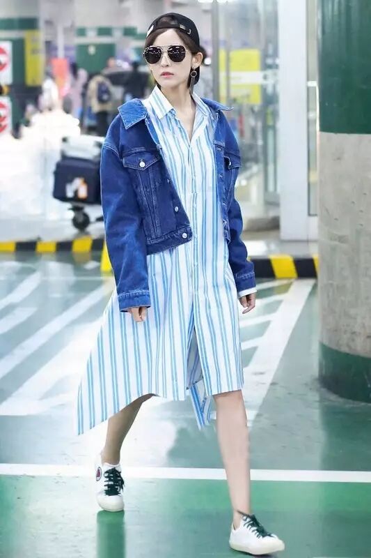 再看时尚女王杨幂,这短裙,小编都超想要,经典迷彩款搭配平版灰T,太棒了~完全是拿着行李要回学校开始新学期啊~