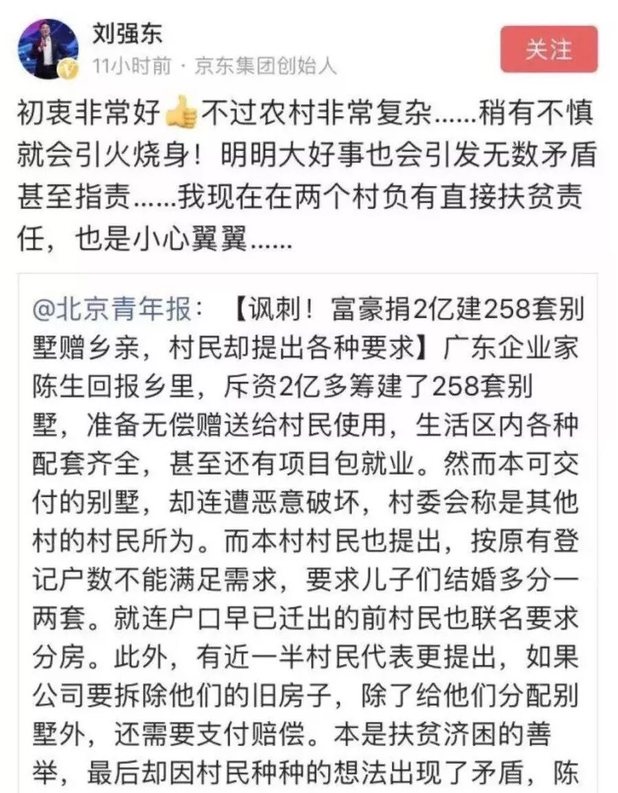 陈生对乡民们贪得无厌的嘴脸失望至极,再没回过家。刘强东也为此事发了微博:“初衷非常好,不过农村非常复杂.......稍有不慎就会引火烧身!”