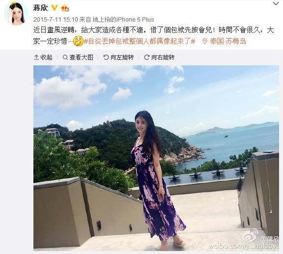 蒋欣在微博晒出苏梅度假照,娘娘的肤白貌美滴画风与苏梅很搭哦~
