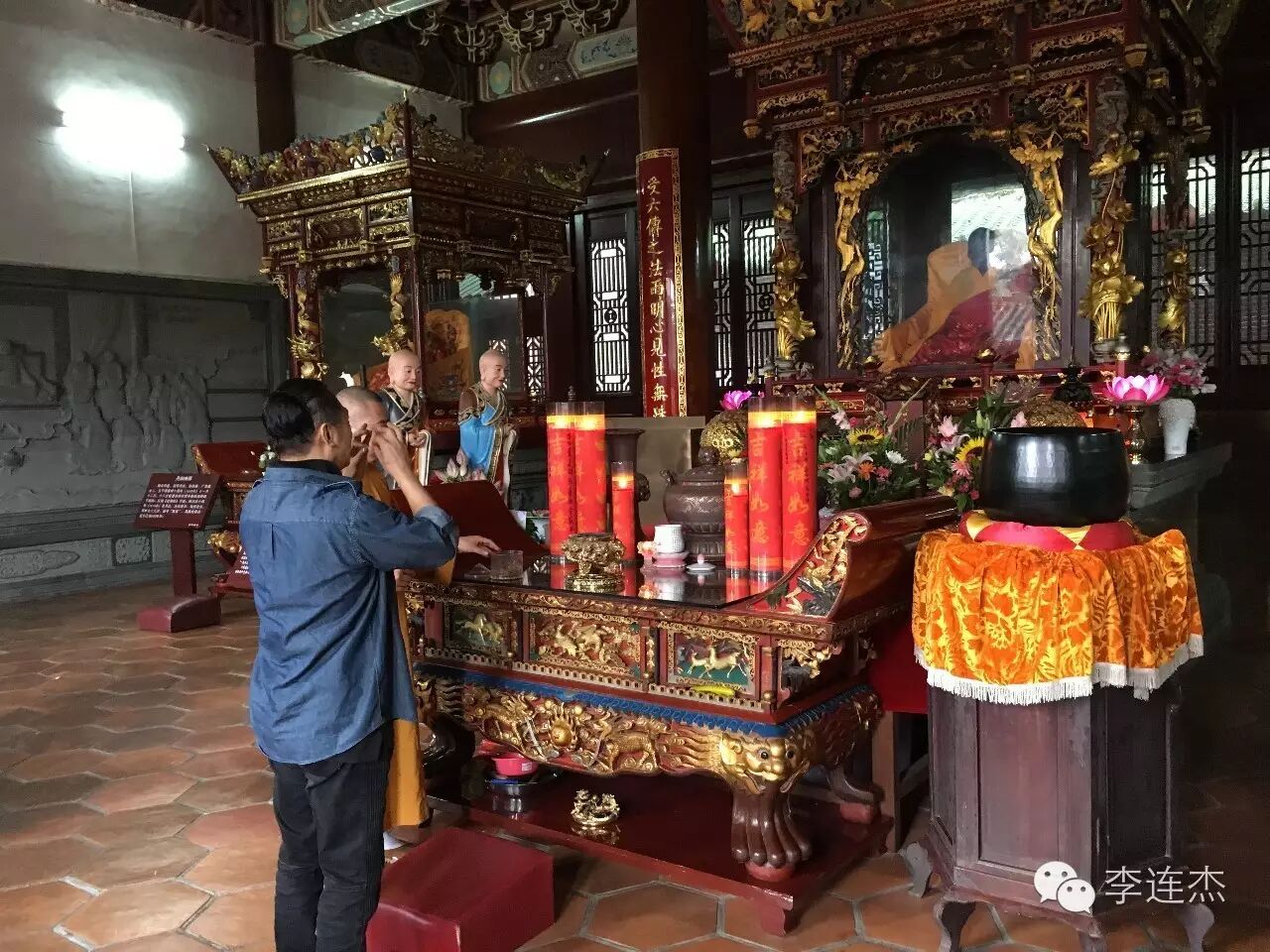今天上午,在传正大和尚的陪同下,李先生一行先是来到了六祖殿,参拜了六祖真身。六祖真身南华寺最珍贵的文物,就是被僧人称作镇山之宝的六祖真身像了。这尊中国式的“木乃伊”是由惠能的弟子方辨塑造的。其方法是,在惠能圆寂前,身披袈裟,尽腿盘屈,打坐入定,不吃不喝,使体内营养和水分逐渐耗尽,最终坐化圆寂。然后将遗体放在两个对盖密封的大缸之中的木座上,座下有生石灰和木炭,座上有漏孔。经过相当时间后,内脏和遗体上的有机物质腐烂流滴到生石灰上,不断产生热气,水份被吸干,遂变成坐式肉身干体。然后进行塑造,先“以香泥上之”,然后加布,再“以铁叶、漆布固师颈”。由于方辨是惠能的弟子,不止一次为惠能塑过像,对他的音容相貌、气质神态有深刻的了解,因此这尊塑像很成功的反映出惠能超脱的气质和高僧的形象,成为流传万古的真身像。