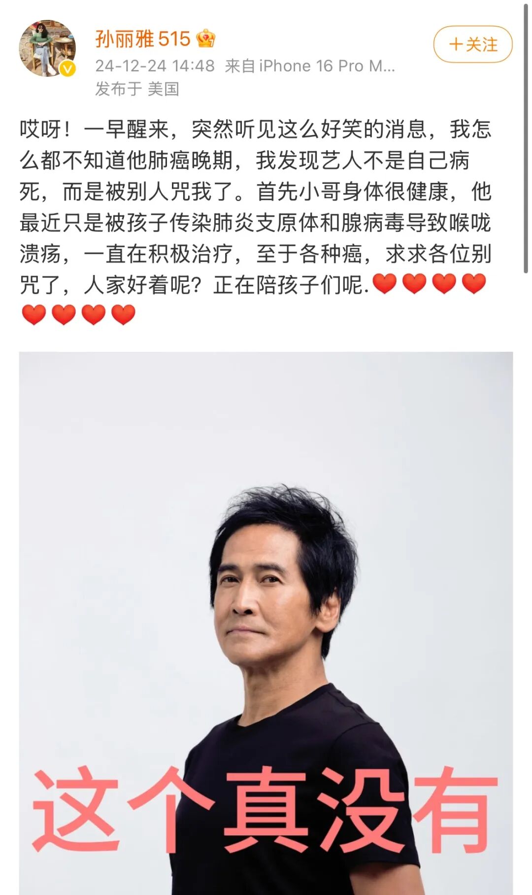 齐秦妻子发文:“求求各位别咒了” 羊城晚报 港台男星 2024-12-24 16:22:30 202 创作不易,用心坚持,欢迎请BaGua喝几杯爱心咖啡!打赏并支持本文 打赏并删除本文 近日,著名歌手齐秦被曝出罹患肺癌晚期,目前正在北京接受积极治疗。这一消息引起了广泛关注和讨论。12月24日,据@中新文娱 消息,今日有消息称齐秦罹患肺癌晚期,其家属对此予以否认,透露齐秦此前只是患普通感冒,目前已痊愈,正在云南练高尔夫。随后,齐秦妻子孙丽雅在微博上就媒体报道齐秦晚期肺癌一事做出澄清。表示齐秦只是被孩子传染肺炎支原体和腺病毒导致喉咙溃疡,并且一直在积极治疗。事实上,齐秦这段时间一直频繁出现在公众视线中。上个月,齐秦才在苏州召开了个人演唱会,从当时观众拍摄的视频和照片来看,齐秦气色看上去非常不错,看不出来有任何患病的迹象。同样是11月,齐秦公布了自己的新歌《稀客》,并录制视频讲述这首歌的幕后创作。不久前,齐秦又宣布,将于今年12月31日晚和赵传、叶世荣一起在北京举办跨年演唱会。公开资料显示,齐秦,1960年出生,华语流行乐男歌手、音乐制作人、词曲作者、演员。1981年,发行个人首张音乐专辑《又见溜溜的她》正式出道。1985年,凭借音乐专辑《狼的专辑》获得广泛关注。1986年,主演个人首部电影《芳草碧连天》。1987年,发行的专辑《冬雨》连续七周登上中文金曲龙虎榜冠军位置,其中的歌曲《大约在冬季》获得第11届十大中文金曲“十大金曲奖”。1988年,加盟滚石唱片,并成立“虹”个人音乐工作室。齐秦曾演唱过很多经典歌曲,《狼》《大约在冬季》《外面的世界》《夜夜夜夜》《冬雨》《往事随风》《狂流》《痛并快乐着》等更是让人印象深刻。来源 | @中新文娱、红星新闻、当事人账号编辑 | 艾心校对 | 谢志忠审签 | 岑杰昌更 | 多 | 新 | 闻 创作不易,用心坚持,欢迎请BaGua喝几杯爱心咖啡!打赏并支持本文 打赏并删除本文 感谢您的支持鼓励,我会继续努力的!文章地址:用户邮箱:打赏金额:USDT 请输入数字点击”去打赏“,即可进行打赏支持本文章哦 齐秦 发表评论
