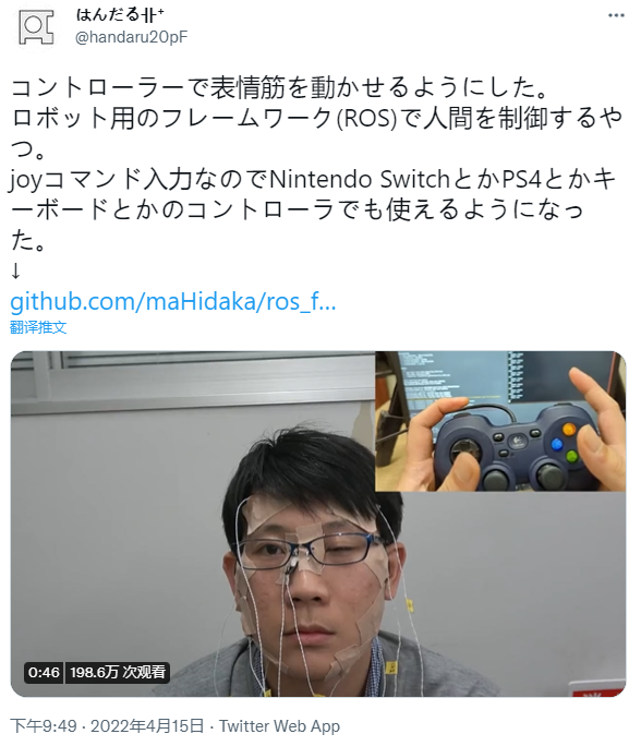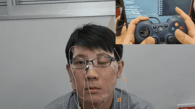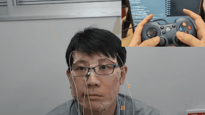 在一个不到1分钟的视频里,一名小哥脸上贴满了胶布和电极,右上角则显示了另一个对准手柄控制器的视角。