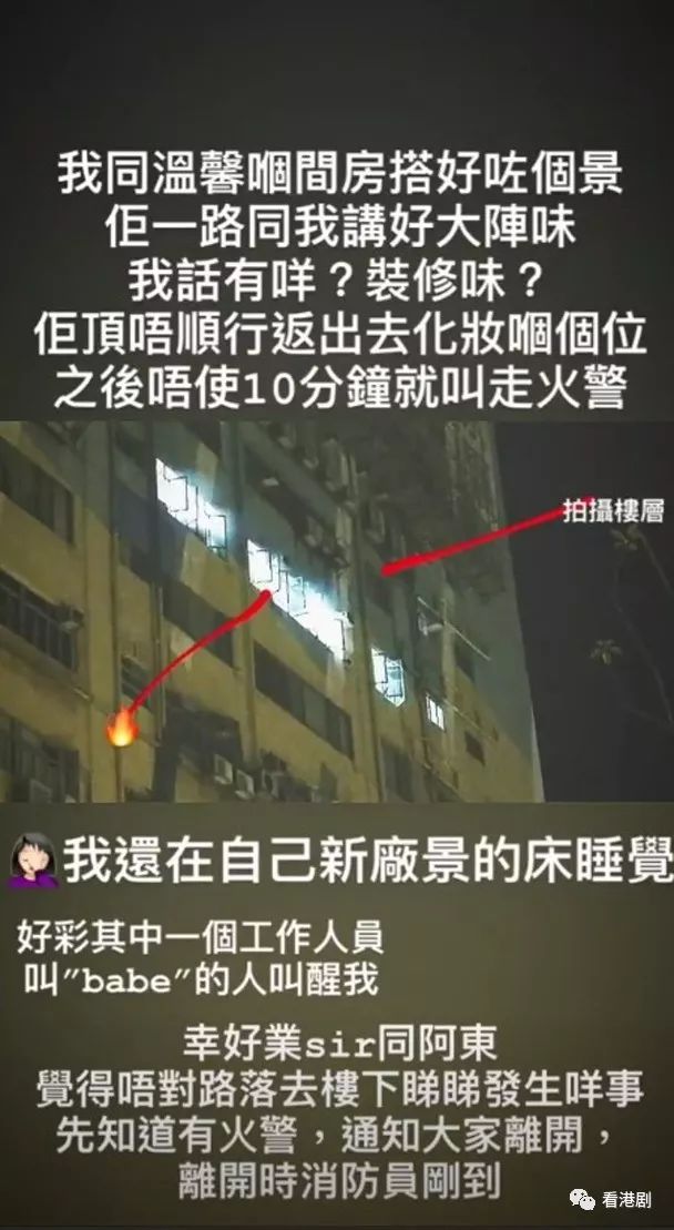 事后各人都有喺社交网甫出现场照片,并发文报平安,其中Rainky喺留言交代走火警嘅情形,佢指:“我同温馨嗰间房搭好咗个景,佢一路同我讲好大阵味,我话有咩?装修味?佢顶唔顺行番出去化妆嗰个位,之后唔使10分钟就叫走火警,我还在自己新厂景的床睡觉,好彩其中一个工人员叫醒我。”