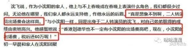 "想象不到小沈阳作为一个二人转演员,居然有这么高的出场费。","刘德华(华仔)的出场费也不一定有小沈阳的高,现在小沈阳的出场费,就算是税后还得有60多万呢!"