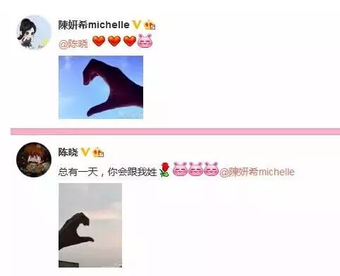 2015年8月,32岁的陈妍希和小她4岁的陈晓宣布恋情,两人还共同发布了对着天空比爱心的照片,颇为甜蜜。据悉,两人因合作拍摄电视剧《神雕侠侣》而擦出爱的火花。去年3月开始交往,8月底正式公布恋情后,两人发展迅速,同年10月陈晓在巴黎向陈妍希求婚,以2克拉钻戒成功将女方“套牢”。