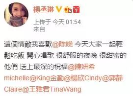 当天晚上,陈妍希还带陈晓和自己的几位圈内好友一同聚餐,聚餐结束后,杨丞琳也忍不住发微博,大赞陈晓,并送上了对他们两人的祝福“这个情敌我喜欢,今天大家一起轻松吃饭,开心唱歌,很舒服的夜晚,很甜蜜的他们,送上最深的祝福。”