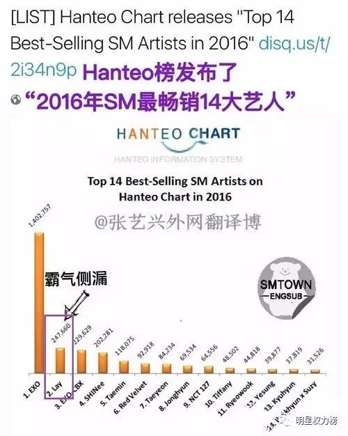 位列SM公司最畅销艺人top2,排在他前面的是他所在的组合EXO。