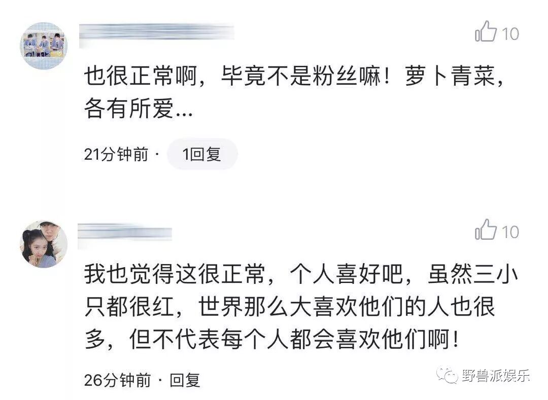 不过调侃归调侃,其实现在也只有一小部分追星族会走极端,介意别人不喜欢自己的偶像,大部分粉丝还是理智追星,不听或者不爱听都很正常,在这个新闻底下有不少TFBOYS粉丝就回复——