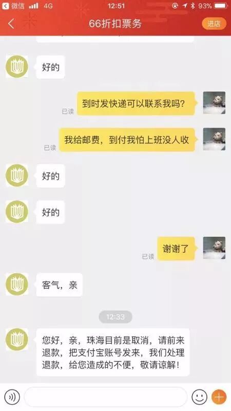 最近客服联系他退票了!