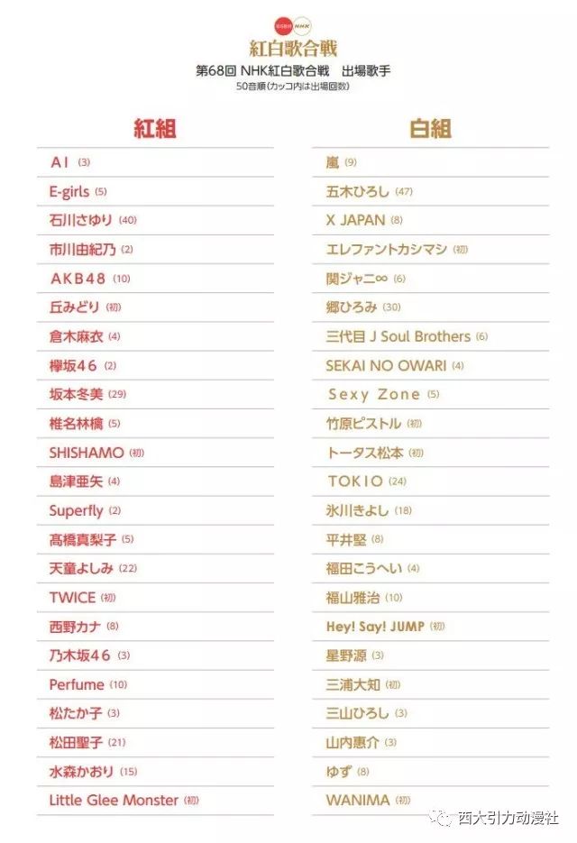 在千呼万唤之际,NHK终于公布了激动人心的第68届红白歌合战名单,之前日媒曝料的内定人选都上了。我们也可以看到众多熟悉的歌手、组合名字,本次共46组艺人,岚、关8、福山雅治、AKB48、仓木麻衣、西野加奈等常规在列,Hey!Say!JUMP、三浦大知、TWICE、Little Glee Monster等则是首次登上红白!明年将引退的安室奈美惠没有出现在红白名单之中。红组主持人有村架纯,白组主持人二宫和也。