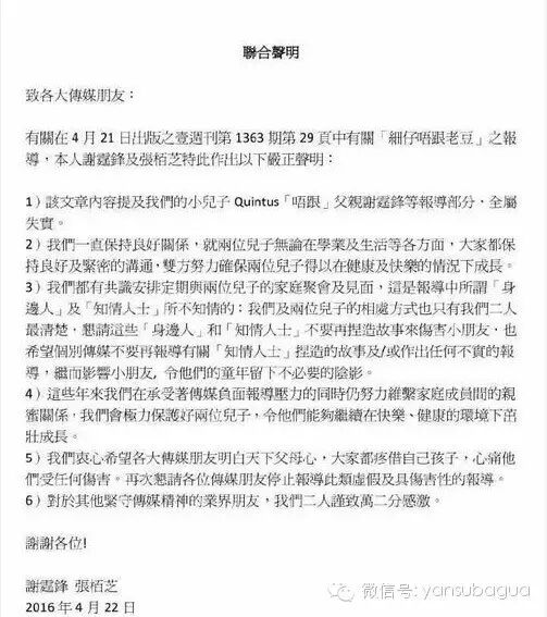 谢霆锋和张柏芝在离婚后还要两方经纪人联合发声明,就是不想两个小朋友有“被学校拒绝”的形象,结果现在台湾媒体又出这个情节再加码小儿子和爸爸关系不好?