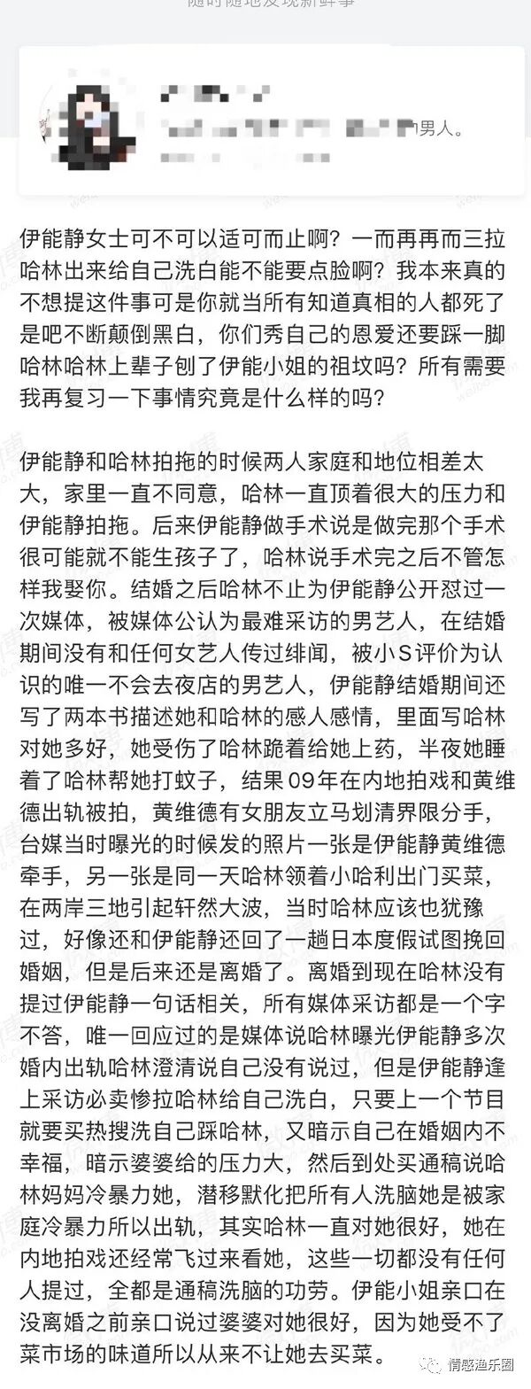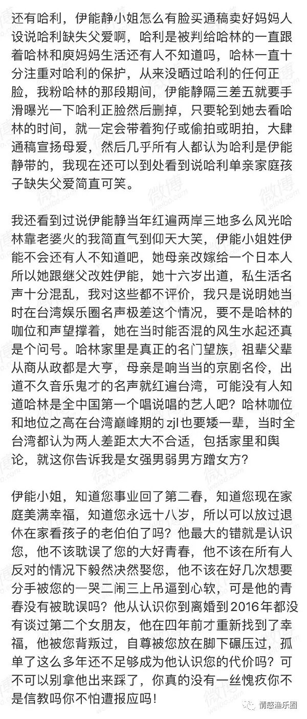 在长文中,庾澄庆粉丝不仅用文字回忆了当年庾澄庆与伊能静的婚姻关系,也提到了当年伊能静与黄维德之间的事情,包括后续伊能静与庾澄庆离婚后,男方从未提到过女方相关,但伊能静却频繁cue到前夫疑似为自己炒作,此外,还有两人共同的儿子哈利,粉丝认为伊能静经常拿哈利说事,晒哈利照片,疑似故意炒作好妈妈人设,但实际上,哈利的抚养权被判给庾澄庆之后,庾澄庆一直十分注意保护哈利的隐私。