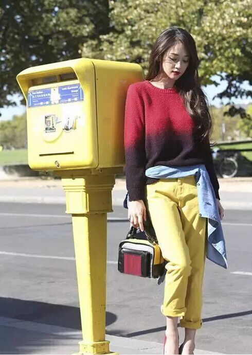 红黑渐变套头毛衣保暖又颇具风情,明黄色休闲裤的撞色搭配带来视觉冲击,使人眼前一亮。
