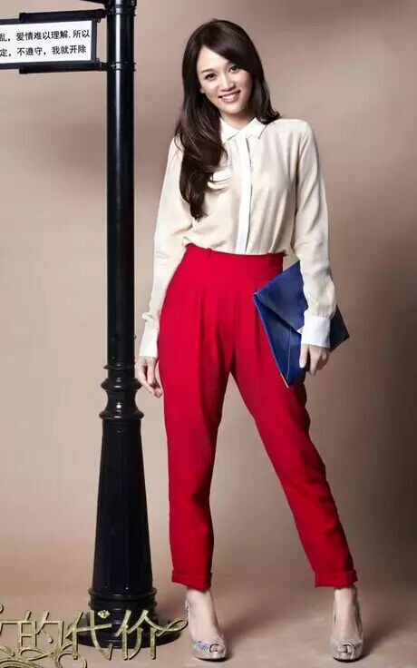 中规中矩的白色衬衫或许是职场标配,但搭配上明艳的红色高腰裤和宝蓝色信封包就呈现出较为独特的OL风格。高腰裤修身且将下半身比例拉长,再加上高跟鞋的辅助,整个人视觉上轻松增高十五公分,是身材娇小的职场女性的不二之选。