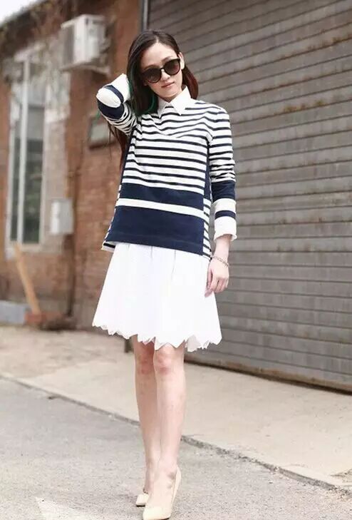 简洁干练的条纹翻领拼接T塑造女强人形象,白色半身不规则短裙搭配温和简单的裸色高跟鞋又透出些许少女情怀。刚柔并济,大方又不失可爱。