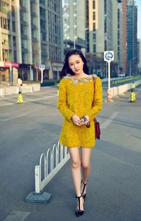 明黄色马海毛连衣裙彰显俏皮可爱,酒红色单间小包和黑色T字高跟鞋的点缀有带一点点熟女的味道。整体风格活泼又不轻浮,是向女人蜕变中的女孩们的绝佳之选。