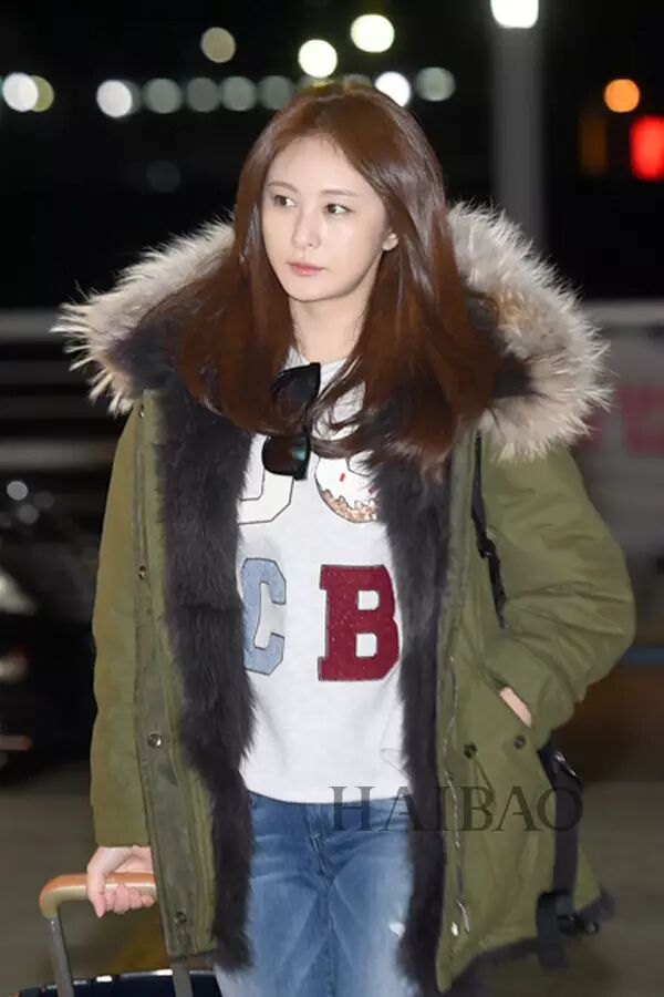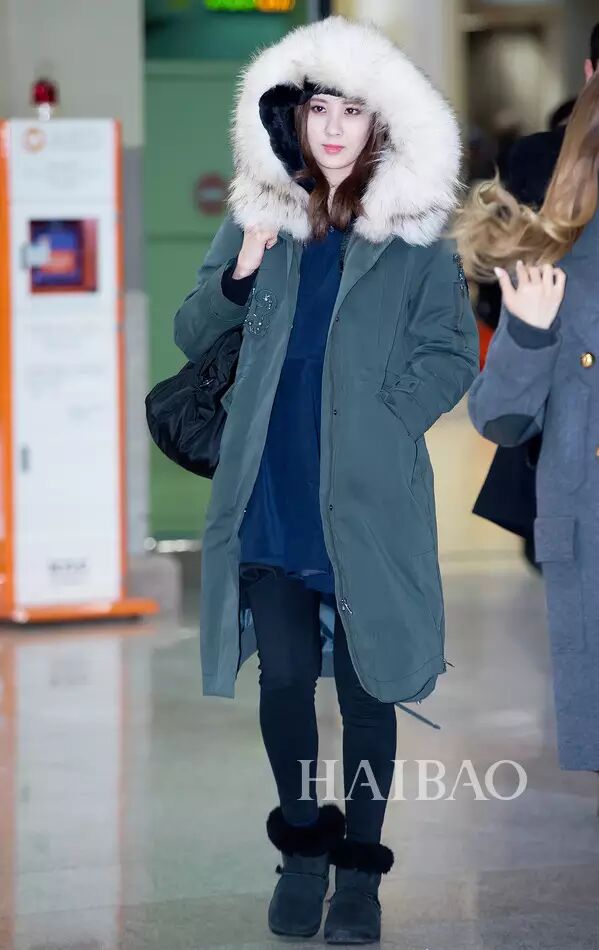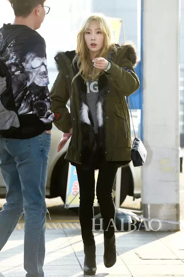 少女时代组合成员泰妍12月1日韩国仁川机场街拍:身着G-Cut军绿色派克大衣,背Lamatt黑包