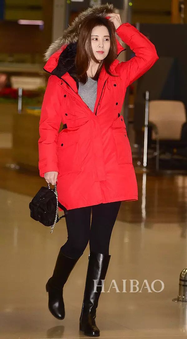 少女时代组合成员徐贤11月26日韩国仁川机场街拍:身着NII红色羽绒服