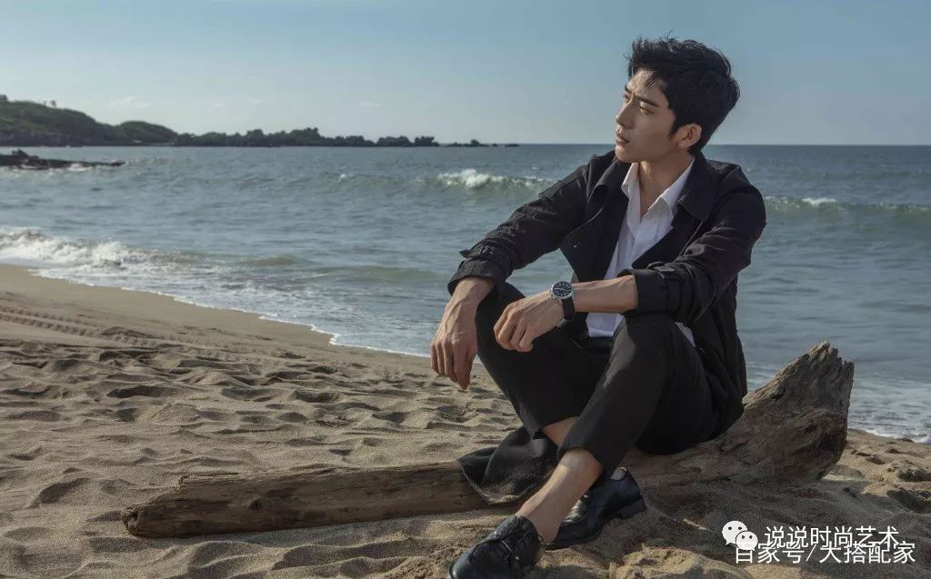 井柏然白衬衫搭配一身黑色休闲西装坐在海边,目光看向远方有一种寂寥感,五官线条透出俊朗,大长腿有一些无处安放。