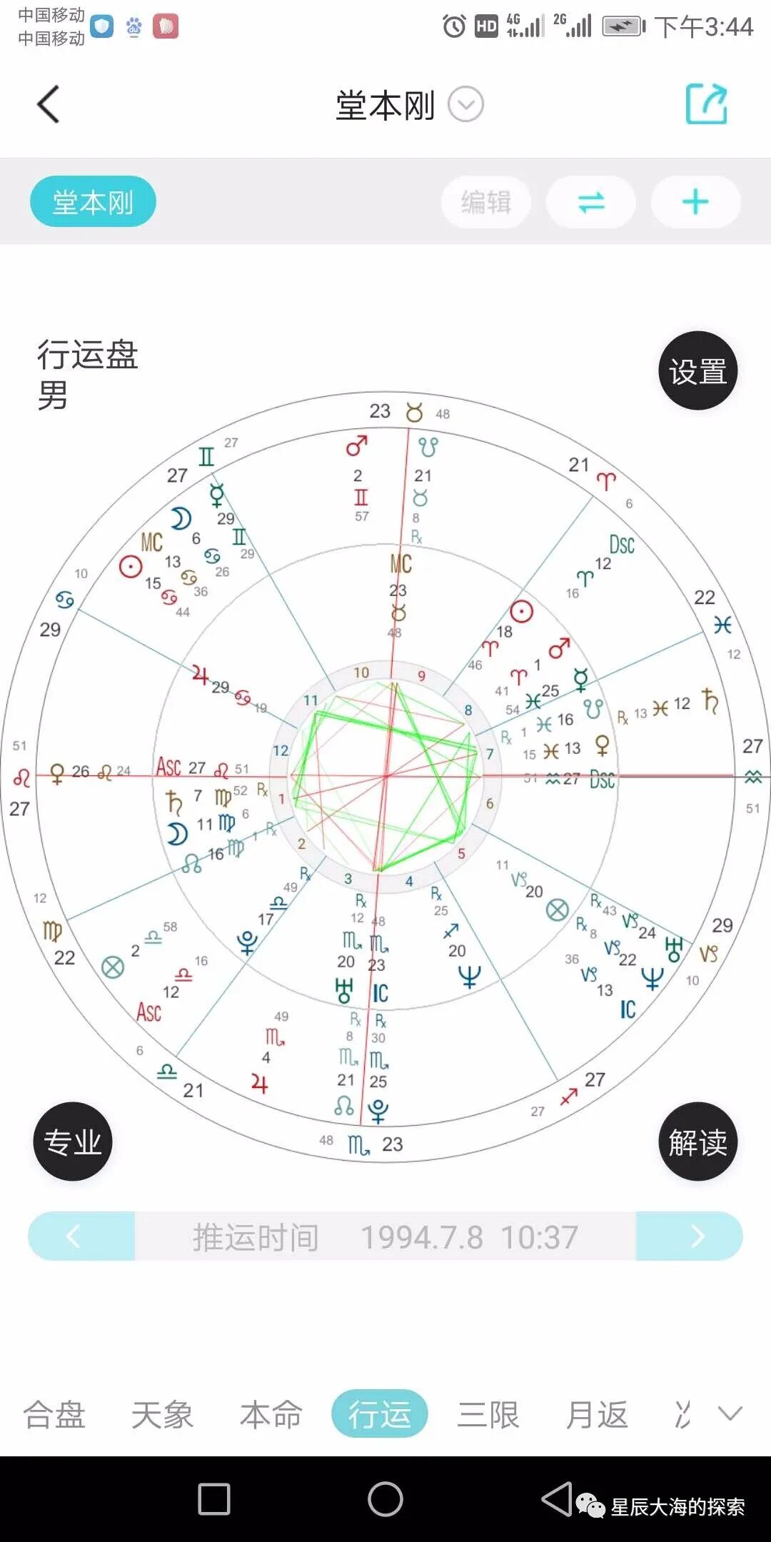 再一次的,太阳弧的行运中几乎所有重要星体之间的相位都是再一次的强调了他本命星图中的那颗矛盾且敏感的土星合月亮落处女,月亮金星对分相关于对自我的高度自律和要求和对他人的超乎寻常的仁慈带来的各种矛盾。比如:太阳弧中的上升点与本命的月亮合相对分本命的金星,让他想要成为一个完美的人,而忽视自己“温柔单纯的爱着世人,但是也希望被世人温柔相待”的需求。太阳弧土星也再度带着一种世俗的责任感加强了对自己的价值感的一种定义:我想要被需要,因此我要变得世俗世界标准中的更理想的“我”。再次的,这在他敏感细腻的想法和喜好之间往往产生强烈的矛盾和失衡。象征内心情感安全感的太阳弧月亮也落在“自我价值感”的2宫,又再一次的加强了他想要被外界,想要被世人认可而严于律己的倾向。最后,我们可以看到太阳弧的上中天和下中天分别在双子座和射手座,并且同时四分他本命1宫中的土星处女座。他对自我的完美主义和压力随着这个时候事业上的多层面的发展带给他越来越大的压力。
