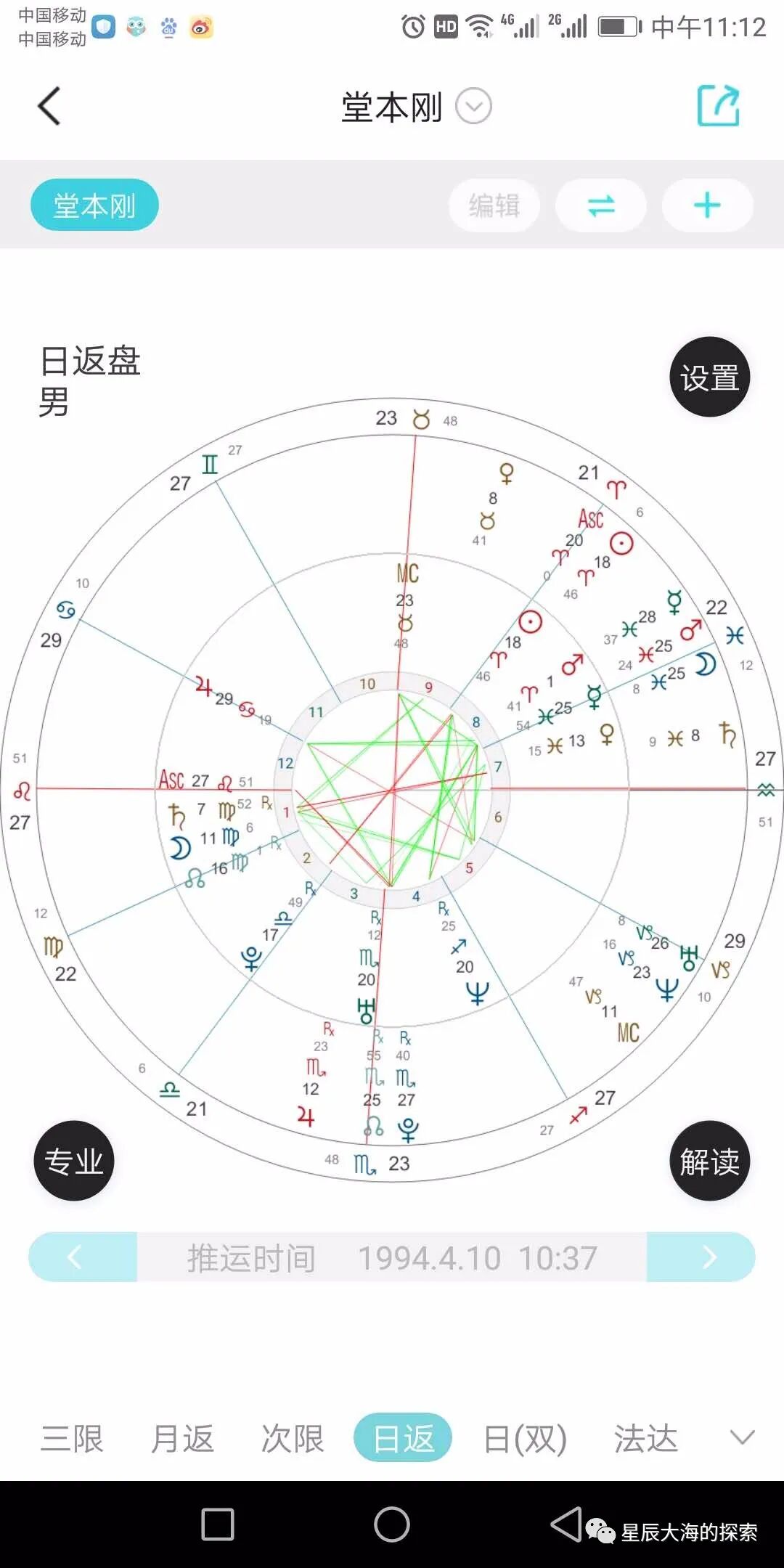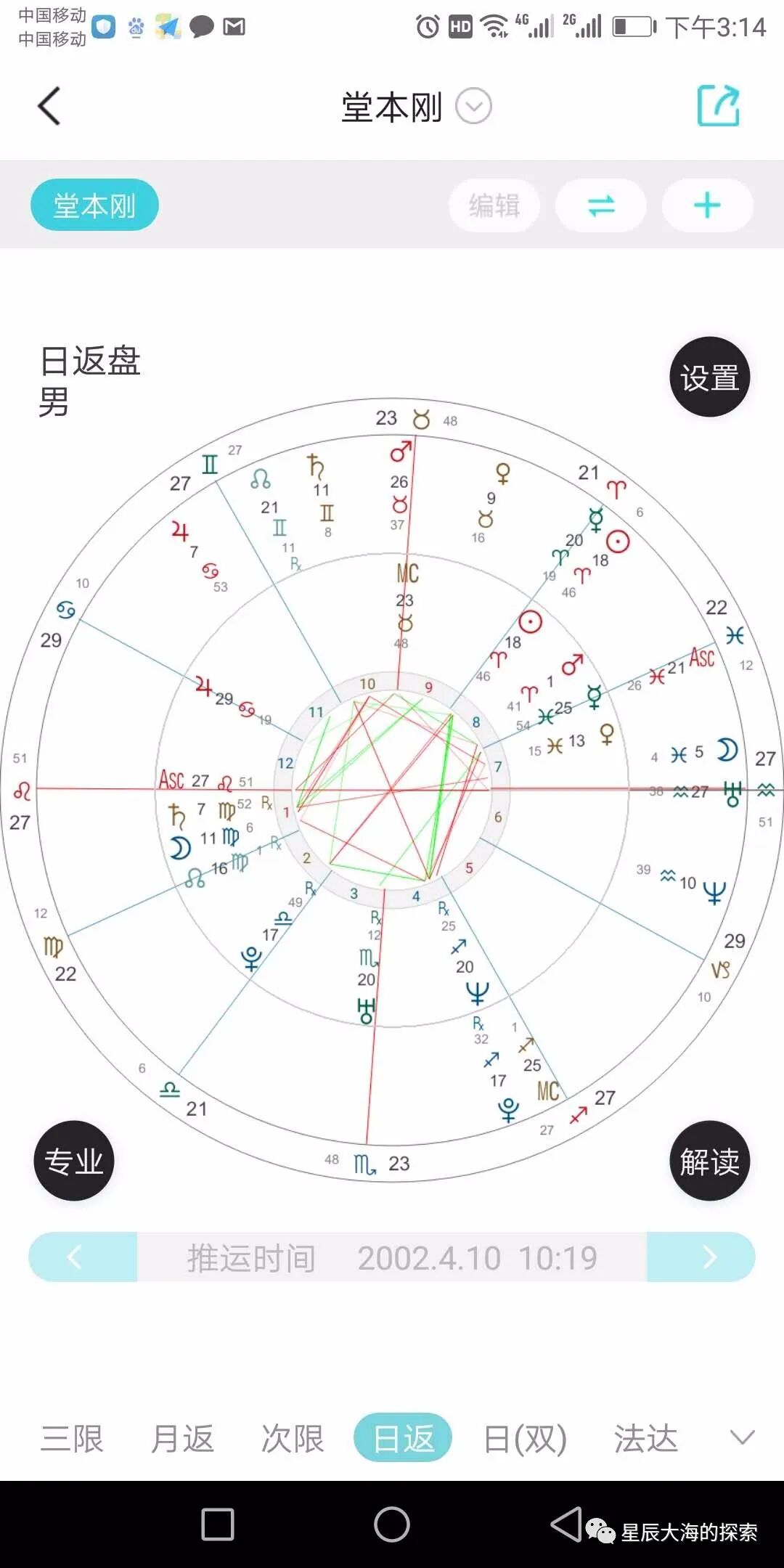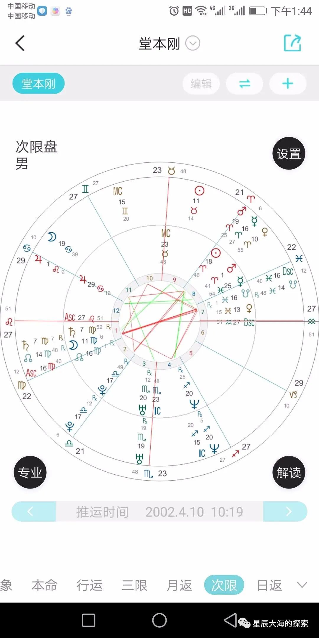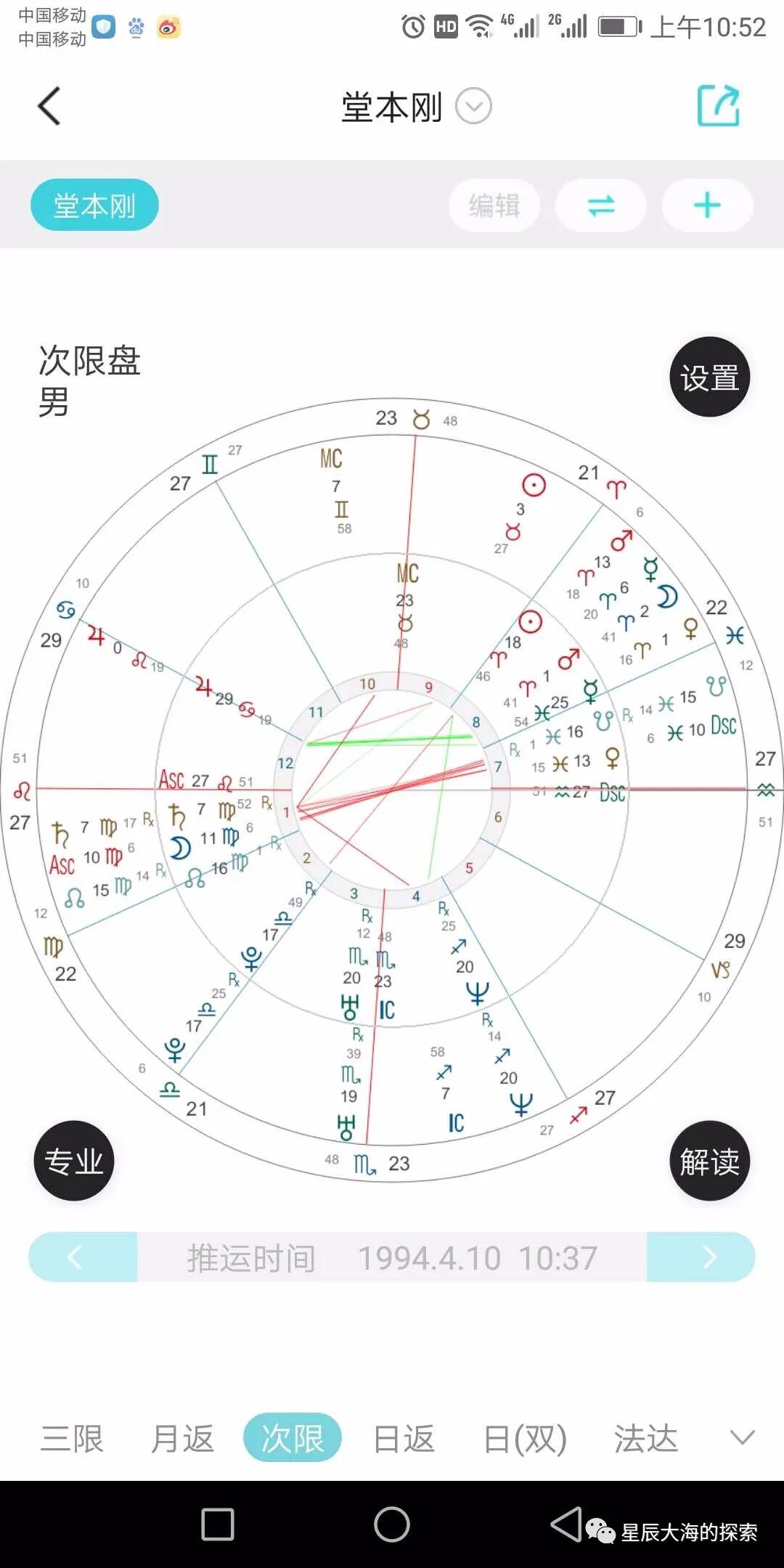 同年的次限盘中,次限白羊座的火星合相本命的太阳与本命的冥王形成对分相分别落在2-8宫,次限的月亮巨蟹座则落在11宫,与本命的日冥对分相之间分别四分。意味着这一年前后,他开始有着强烈的冲动和行动力去挑战权威,去活出自己想要成为的那个真正勇于做自己的形象。次限的月亮落在敏感脆弱的巨蟹座11宫,意味着他对粉丝,对身边的圈子会变得特别敏感,在一边以从未有过的勇气和行动力勇于开始为自己而活着,一边将面临和学习怎样更好的在脆弱的外界中将自己保护在一个坚硬的外壳之下。