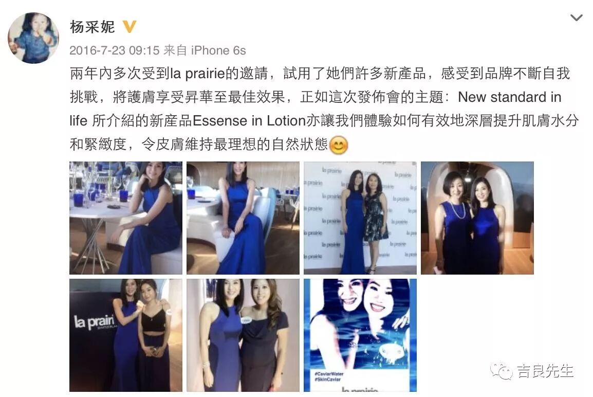 杨采妮和La Prairie的关系一直很好,女神多次为品牌站台,生活中也经常用La Prairie的产品。