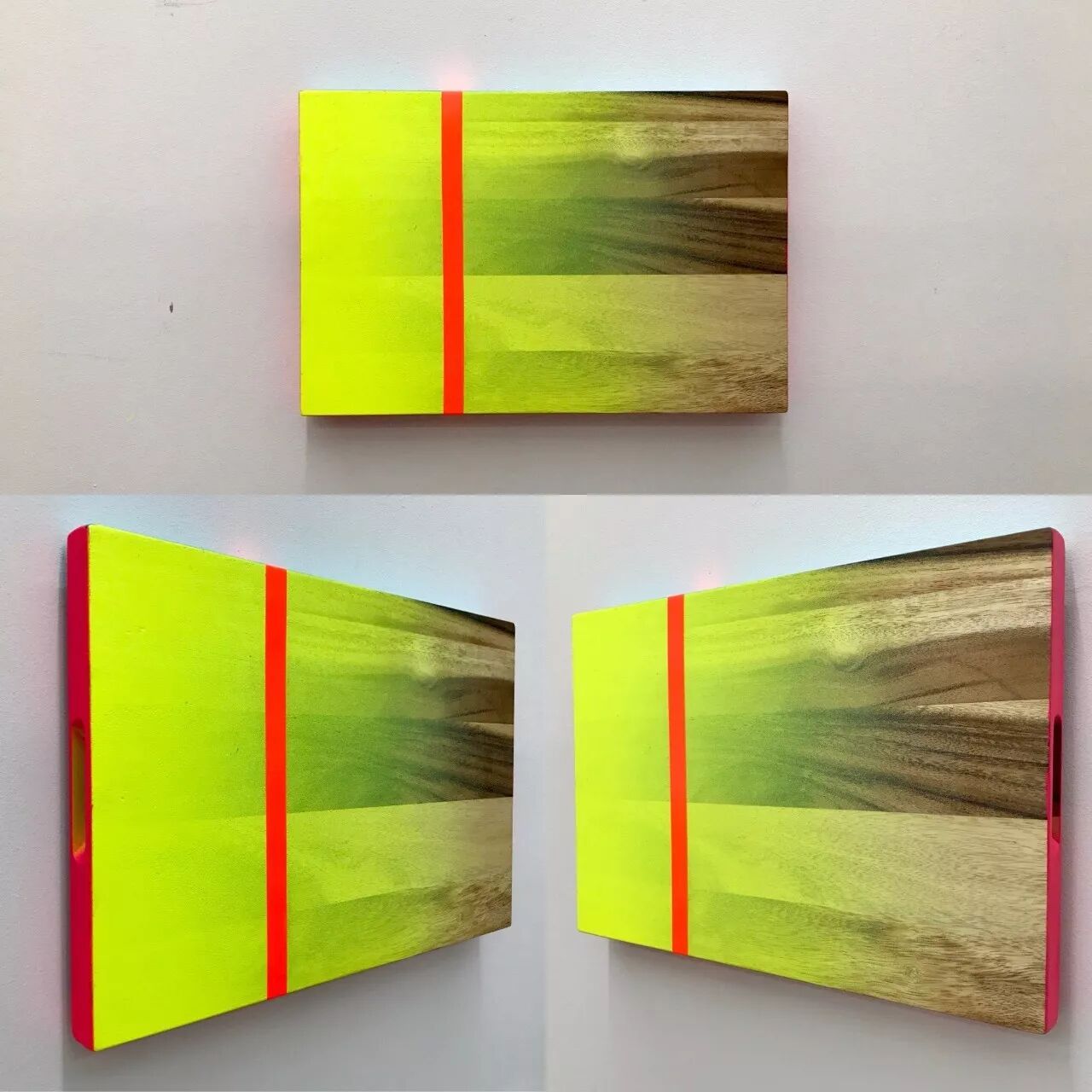 Orange on faded Yellow to Wood with Pink and Cyan on the Edges, 13.0x13.0x39.0cm, Spraypaint on Wood, 2017