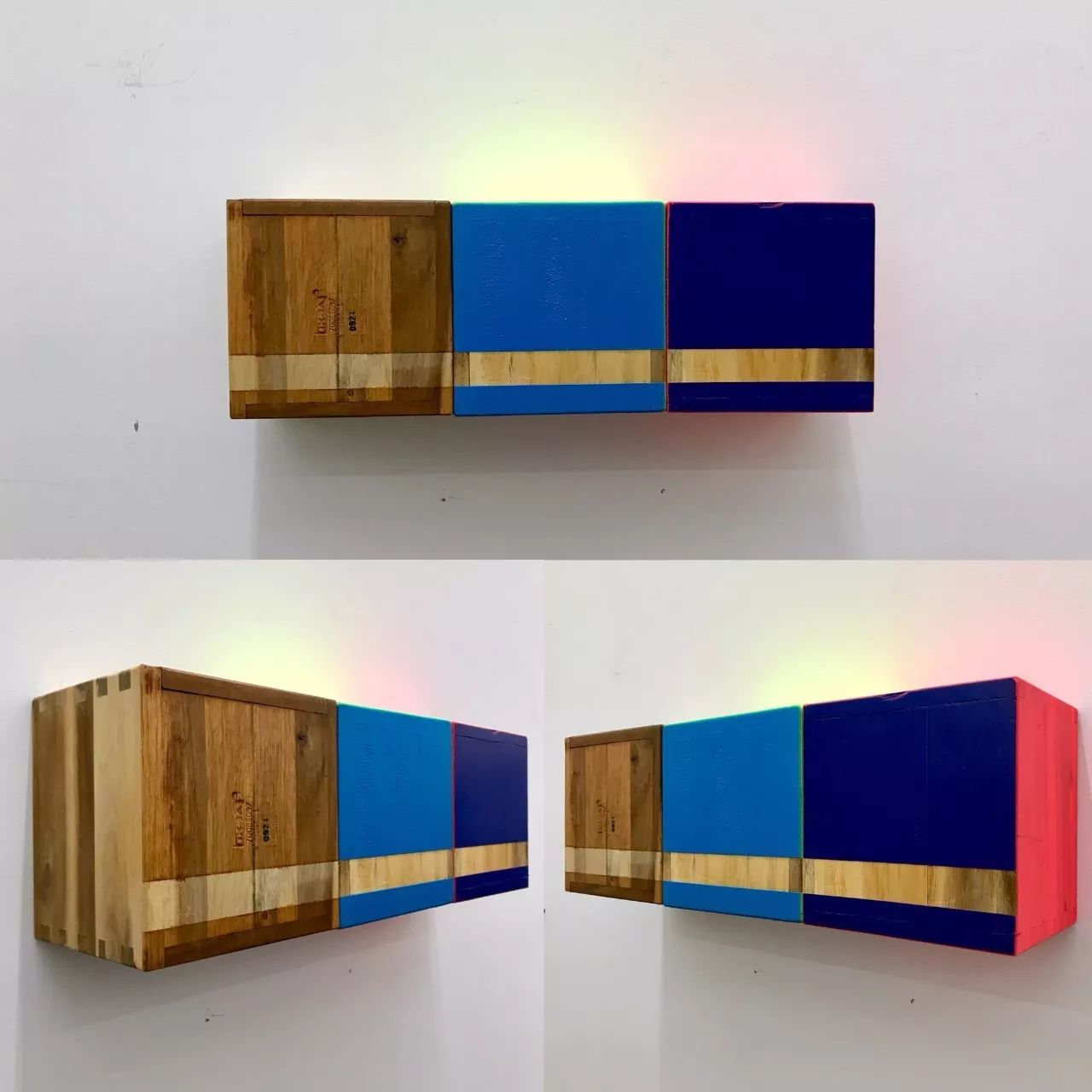 Blue, Red, Pink and Yellow on Woodboxes,13.0 x 13.0x 39.0 cm,Spraypaint on Wood,2017