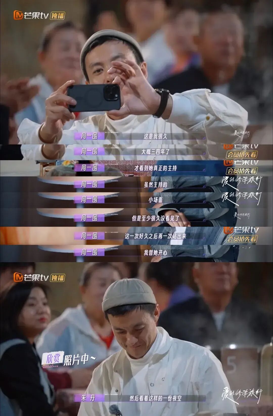节目里,朱丹上台主持,周一围在场下拿出手机为她拍视频,并且感慨说已经三四年没有见过妻子主持了,很为她开心。