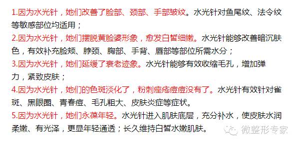 水光针就是将透明质酸、胶原蛋白等高端美容成分直接注入到真皮层,使皮肤充满水分,改善皱纹、肤色、肤质,达到恢复皮肤弹性及美白提升的作用,从而起到抗衰老及解决各大问题肌肤的功效。
