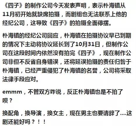 九月,SBS电视台直接宣布放弃《四子》的相关制作。找不到电视台播,同时,导演下车,人家不拍了!