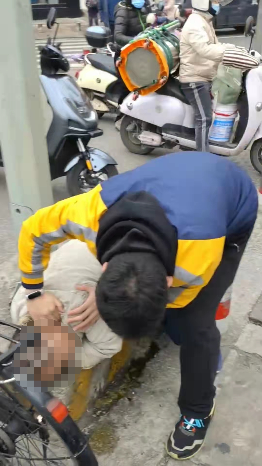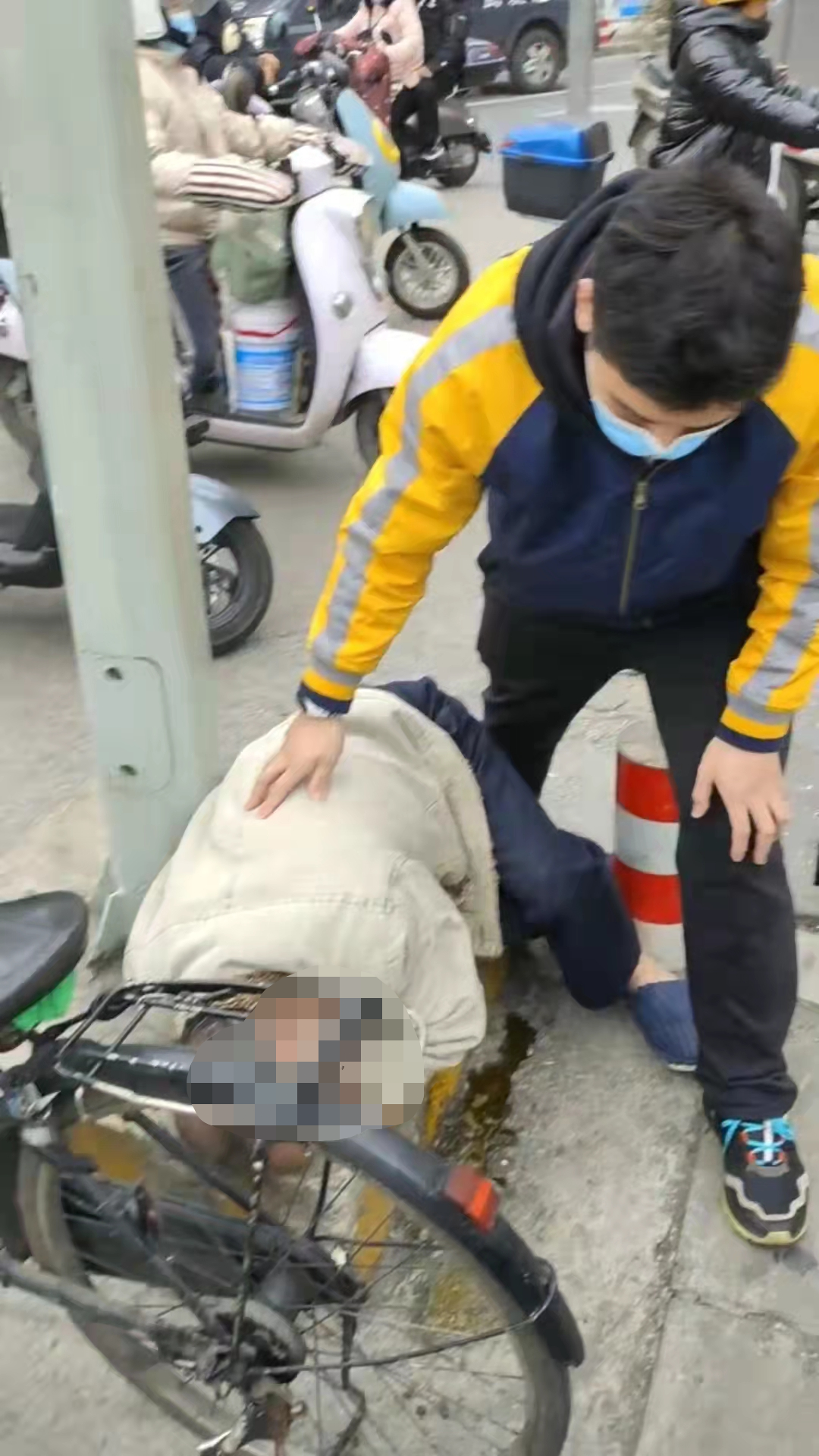 1月26日15点50分,在南宁民主园湖路口的交通安全岛上,一位老师呈坐卧位趴在路口的监控探头下的水泥墩上,拳头紧握,表情痛苦,南宁市第一中学2019级(1)班的张耀同学正巧经过此地,立即上前查看情况。这时派出所民警也刚好到达现场。