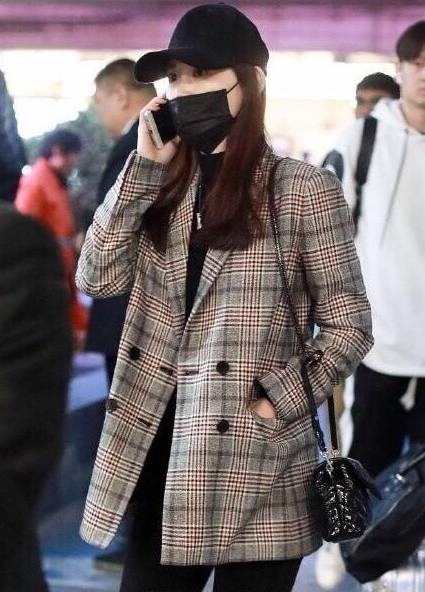 她身穿西装外套,戴着帽子和口罩,形色匆匆。
