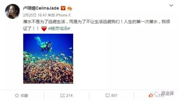 近日,卢靖姗却闹出了一个小小的“乌龙”。25号晚上6点多的时候,卢靖姗发了一条微博,说:“潜水不是为了逃避生活,而是为了不让生活逃避我们!人生的第一次潜水,我领证了!!”