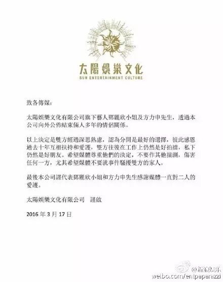 太阳娱乐文化有限公司旗下艺人邓丽欣小姐及方力申先生,透过本公司向外公布结束俩人多年的情侣关系。