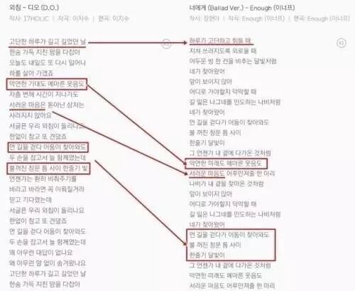 17日,据媒体报道,最近发表的Enough的歌曲《致你》抄袭了EXO成员D.O.于2014年演唱的电影CART的OST《呐喊》中的数句歌词。