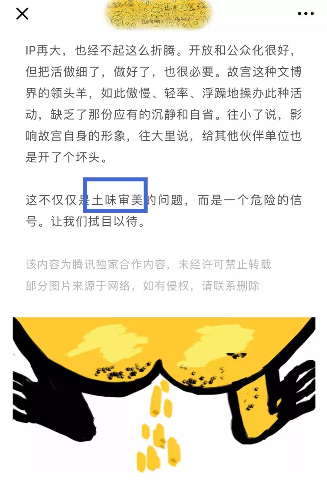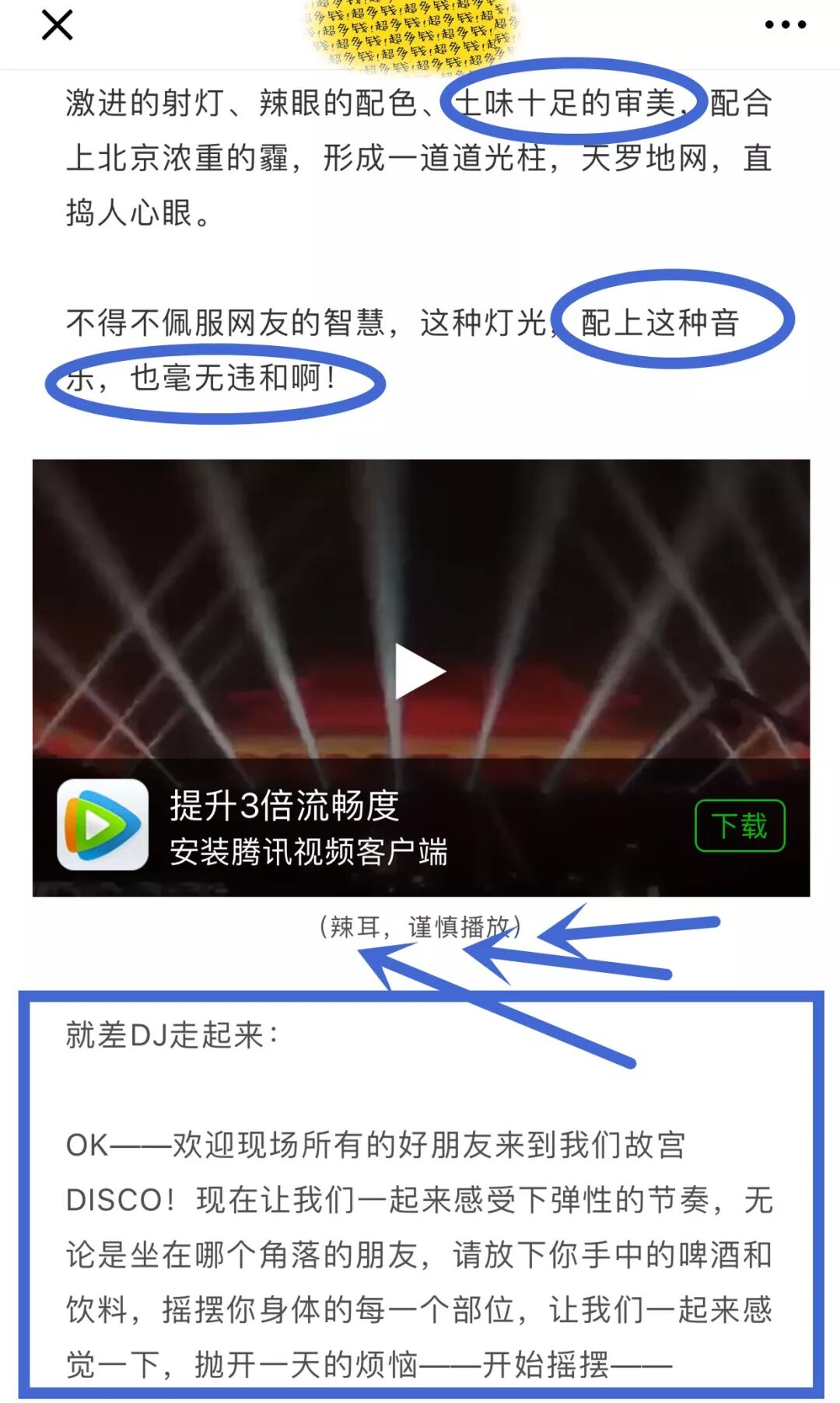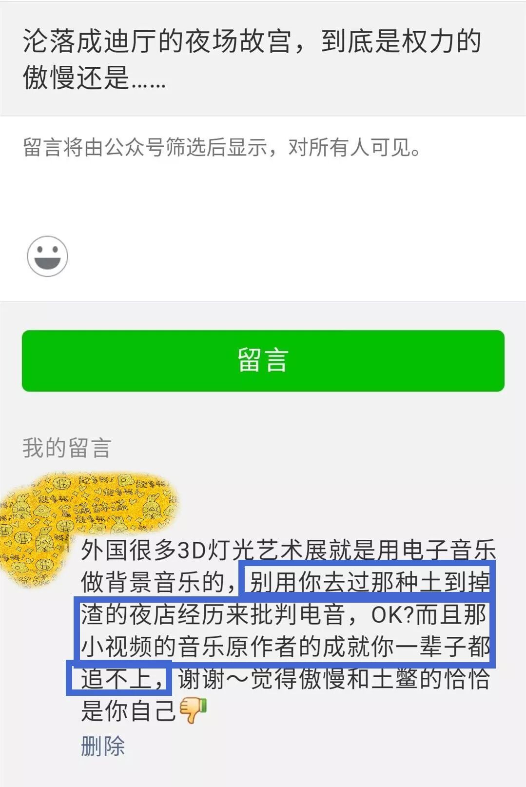 看看该公众号所提及的部分言论,其认为本次“故宫表演”的灯光设计“很夜店”、“很迪厅”之余,将夜店和迪厅的定位直接形容为“土味十足的审美”,一孔之见、断章取义,为视频配上Skrillex的作品《Kyoto》,且与前方的言论相加,表达为“毫无违和感”、“很配这种音乐”、“辣耳朵”,认为Skrillex的《Kyoto》与这位土味笔者大佬眼中的“夜店喊麦”内容很搭配。可以看得出这名土味笔者大佬平日对音乐的修养,恐怕停留于小贱等C-Pop十八流网络歌曲的层级,若将歌单晒出,估计没人比他更土味、更快手。