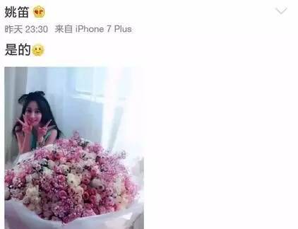 恋情一爆出,这次姚笛没有选择藏着掖着,而是深夜在微博里大方的回应了俩字:是的。镜头中,要地躲在一大捧花后比V,头戴可爱发箍,素颜出镜心情大好。