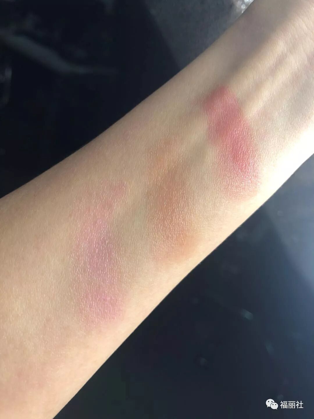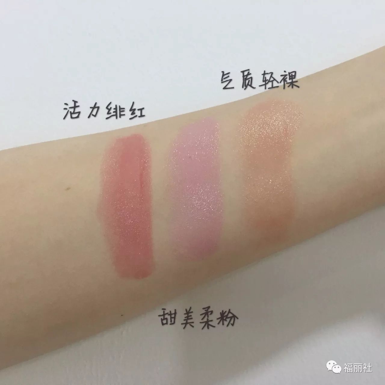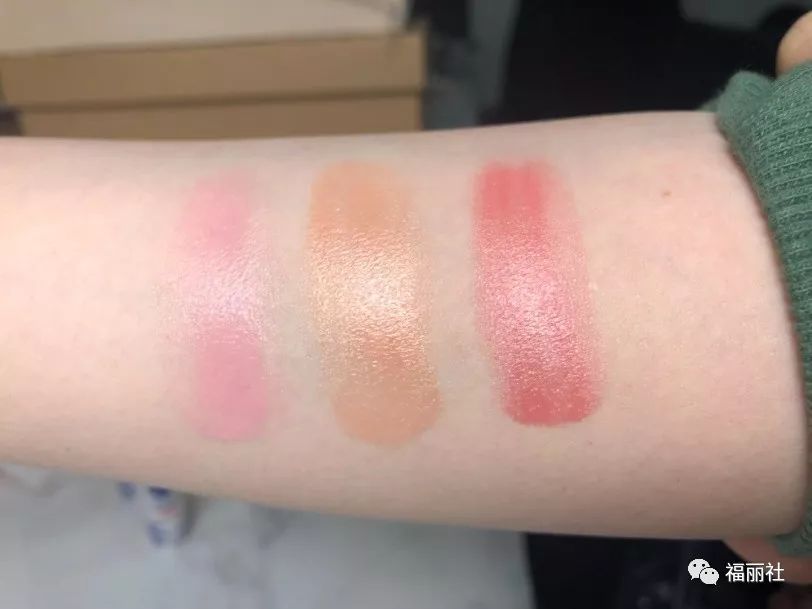 每次拿到新唇膏,不方便卸了口红再上色,首先在手臂上来一波试色。从左到右,唇膏的三款颜色分别是活力绯红、气质轻裸和甜美柔粉,目测都非常实用。微微的珠光非常显气色。