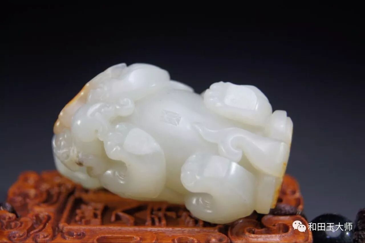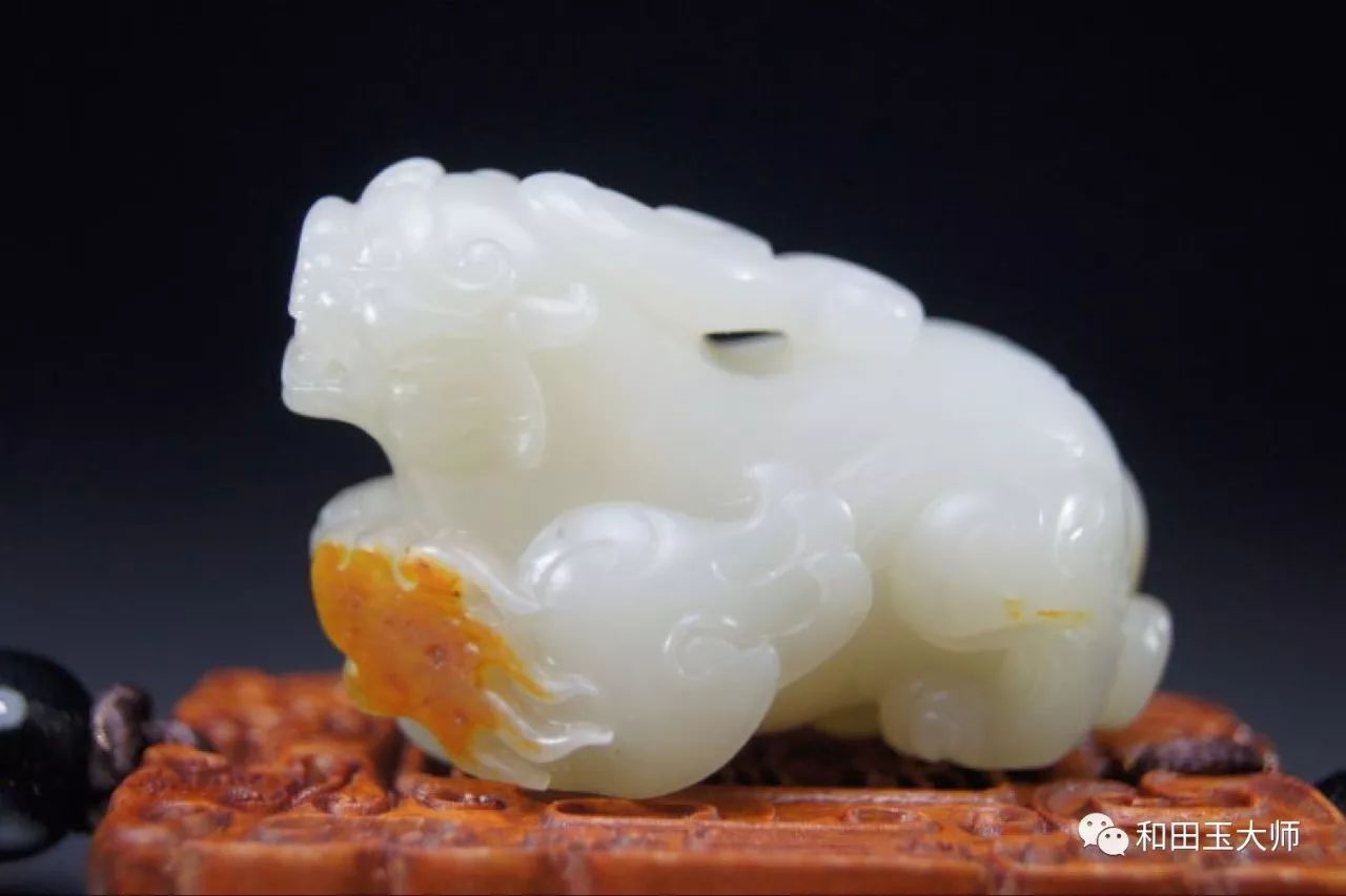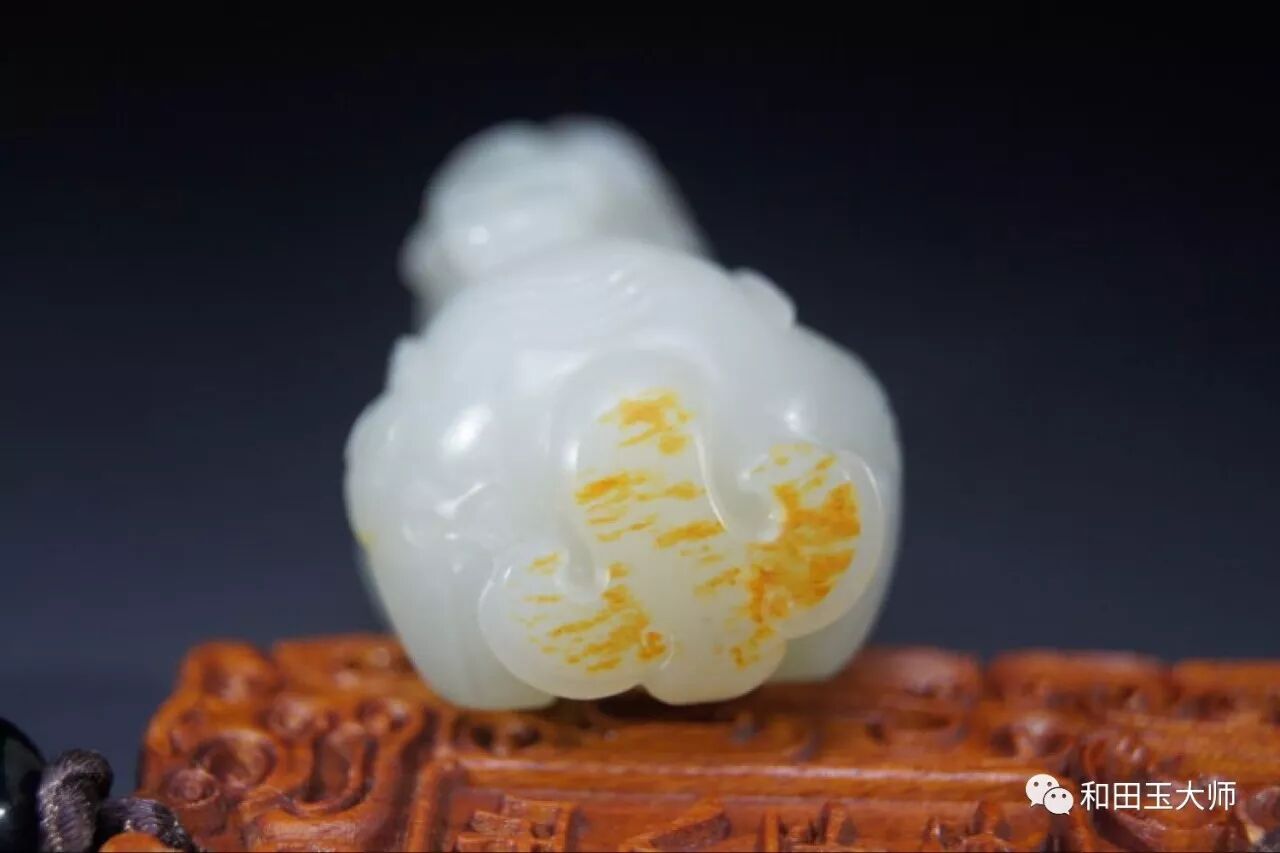 背臀部巧妙的运用到原料上的另一处红皮,虽没有之前那处艳丽,但虚虚实实的呈现状态正好用来表达貔貅尾部的飘逸感。