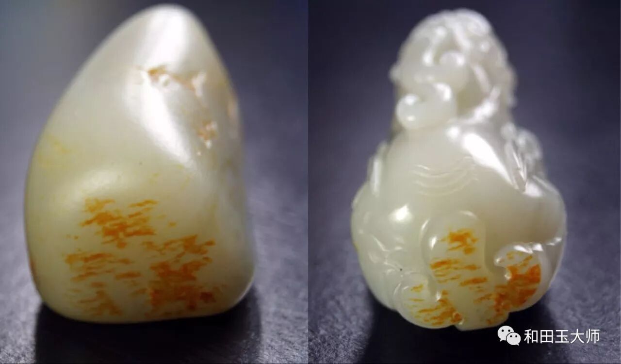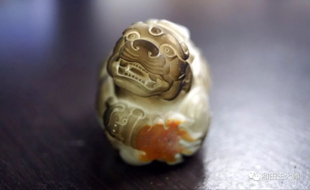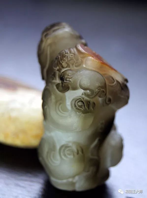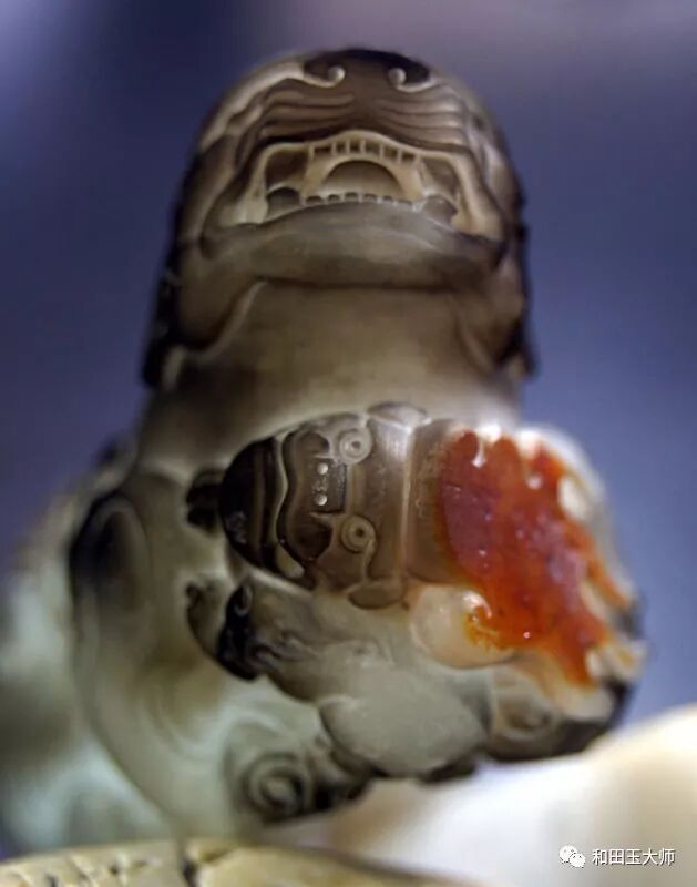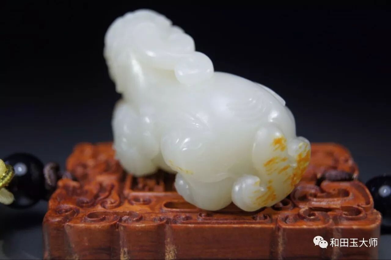 背臀部巧妙的运用到原料上的另一处红皮,虽没有之前那处艳丽,但虚虚实实的呈现状态正好用来表达貔貅尾部的飘逸感。
