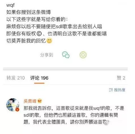 对此,吴青峰怒怼:“这首歌从来就是我吴青峰的歌,你的逻辑有问题,我代表全体团员,请你别弄脏这首歌。”