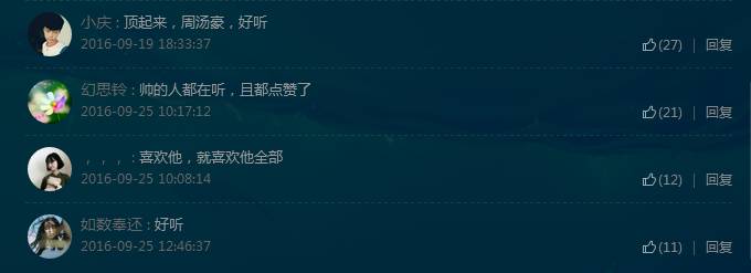 酷狗网友听后大赞,频频发弹幕力撑——“顶起来,周汤豪,好听”、“帅的人都在听,且都点赞了”、“喜欢他,就喜欢他全部”。
