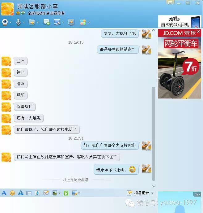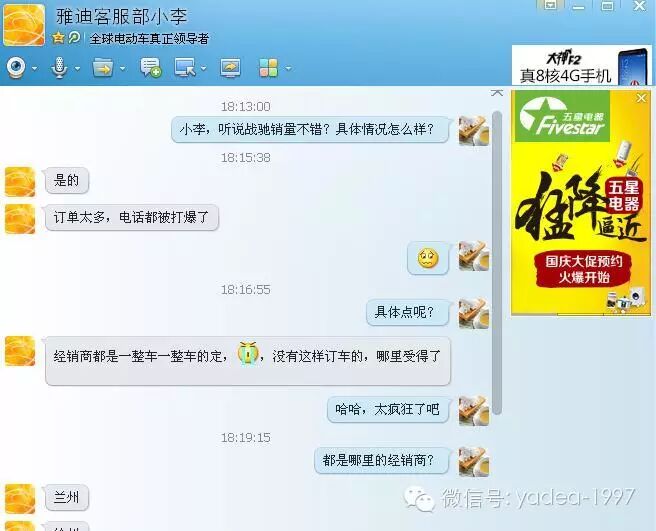 客服部门在QQ上与广宣部门交谈的过程中,直接要求宣传部门停止对战驰的宣传,订单太多,电话不停,发货不及,对经销商无法交代啊!客服人员电话已经接到头晕,回答说到嘴麻,身子坐到腰酸。