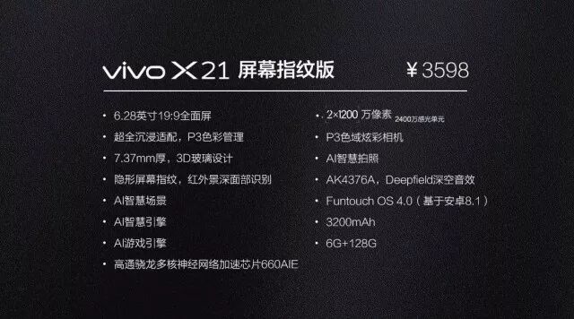 X21售价3198元,3月24日上市;X21屏幕指纹手机售价3598元,3月28日上市。