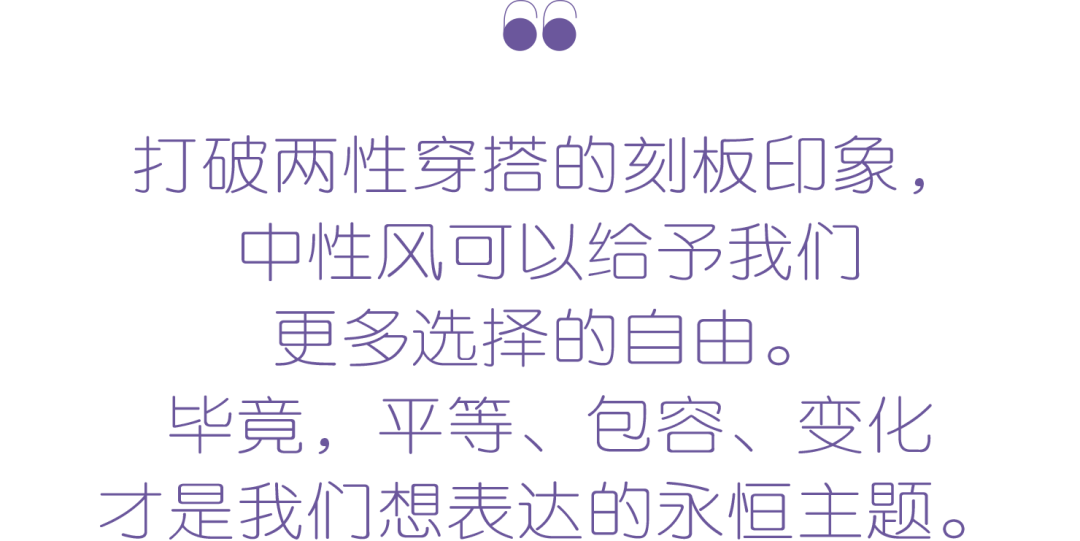 在穿搭上,传统概念里,男装就是西装马甲打领带,女装则是长裙加高跟鞋,而中性风打破了这些束缚,让穿搭更自由。